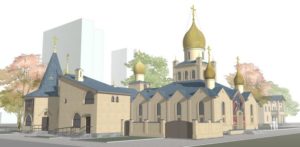 Проект архитектора Д.А. Римши создан по мотивам московского церковного зодчества XV-XVII веков и неорусского стиля XX века.