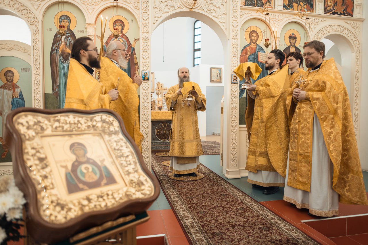 Его Преосвященству сослужили благочинный Одигитриевского округа иерей Петр Панов, настоятель храма протоиерей Елевферий Колодезный, настоятель храма святителя Феодора Едесского в Уварове иерей Анатолий Чуряков и гости в священном сане. Диаконский чин возглавил диакон Николай Поляков.