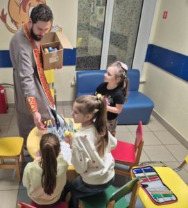 Священники, участники молодежного клуба и сестры милосердия храма преподобной Евфросинии, великой княгини Московской, в Котловке поздравили пациентов и врачей Национального медицинского исследовательского центра здоровья детей, раздавая куличи, шоколадные яйца, а детям — игрушки, раскраски, карандаши.
