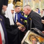 Святейший Патриарх Кирилл благословил присутствовавших на богослужении воинов-ветеранов специальной военной операции и вручил каждому из них иконку Казанской Божией Матери, а также поздравил регента хора молодежного движения «Патриаршие добровольцы» Анну Голик с прошедшим днем тезоименитства.
