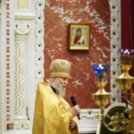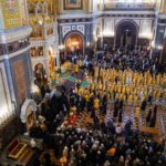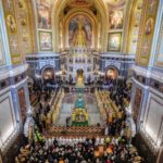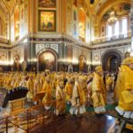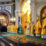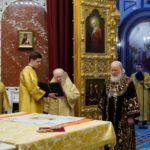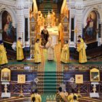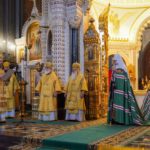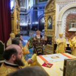 В этот знаменательный день Святейший Патриарх Кирилл совершил Божественную литургию в кафедральном соборном Храме Христа Спасителя в интронизационных облачениях и с копией жезла святителя Петра.